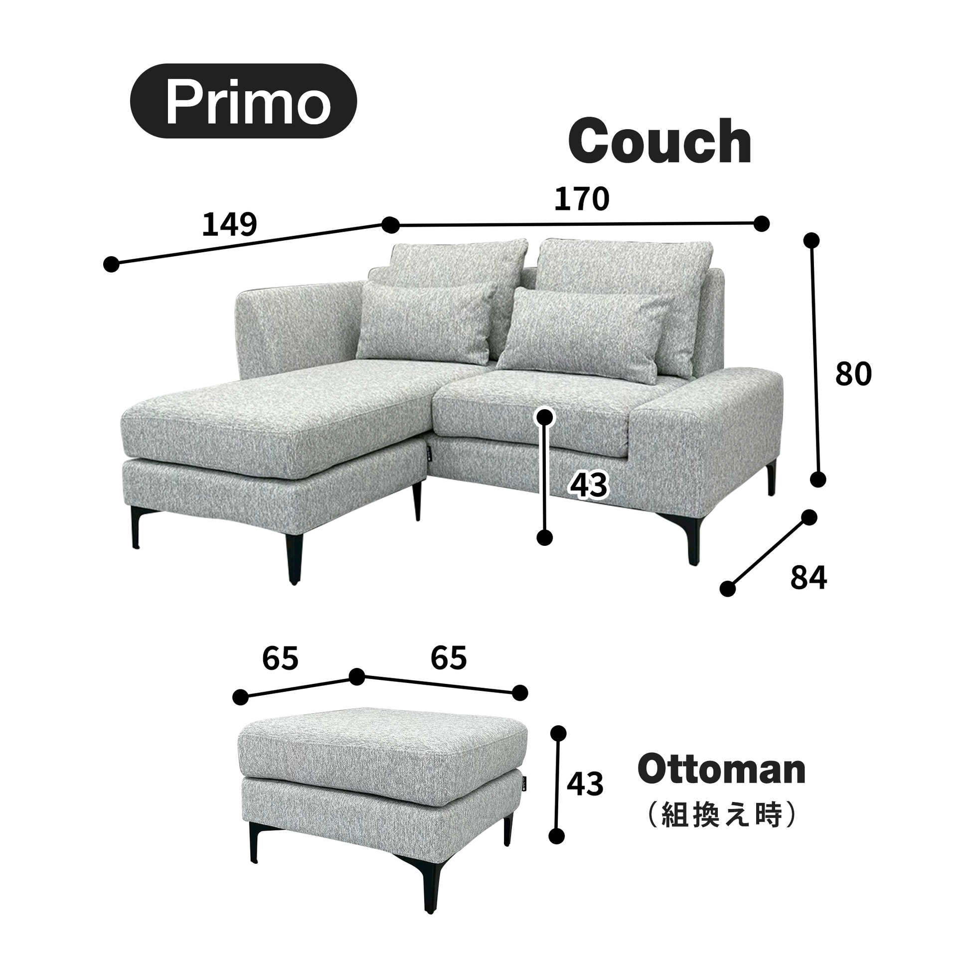 This sofa has a lift-up storage space and the left and right couch sections can be rearranged.